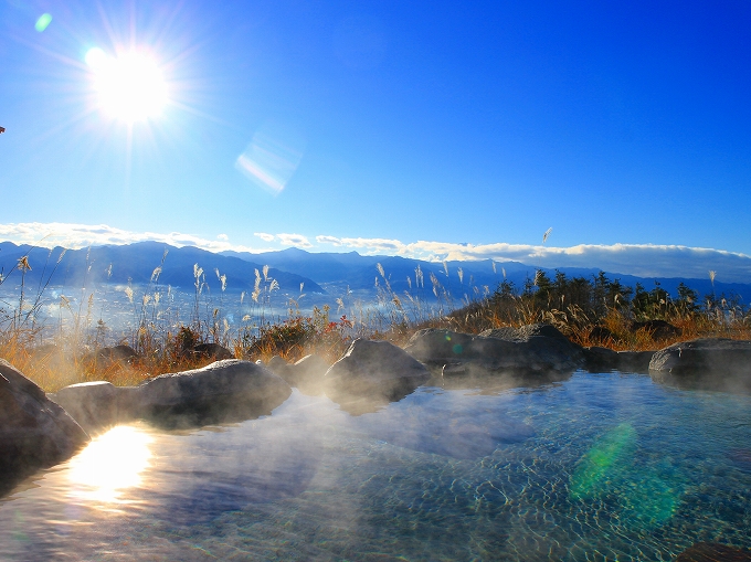 「ほったらかし温泉」は日本一の絶景露天風呂とも口コミで伝わる山梨県の温泉。富士山と甲府盆地の眺望に訪れた多くの人が感動!…